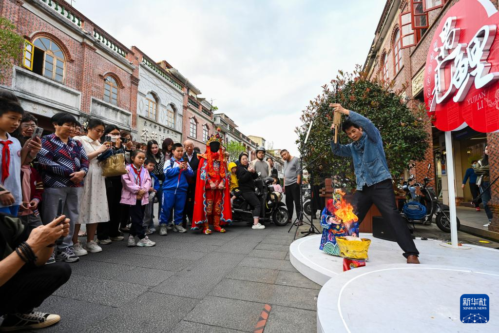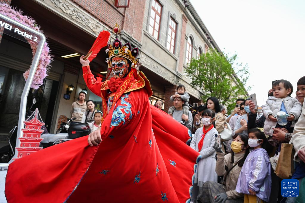 4月10日,在泉州中山路,游客观看变脸表演。新华社记者 周义 摄