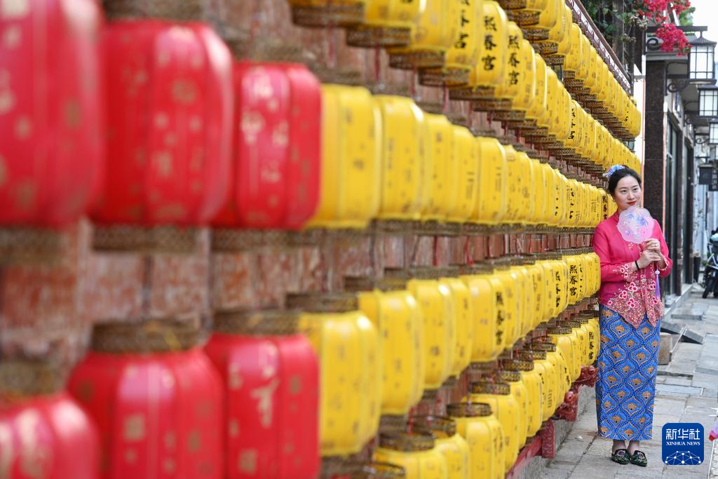4月10日,游客在泉州中山路的一处挂满花灯的墙壁前拍照。新华社记者 周义 摄