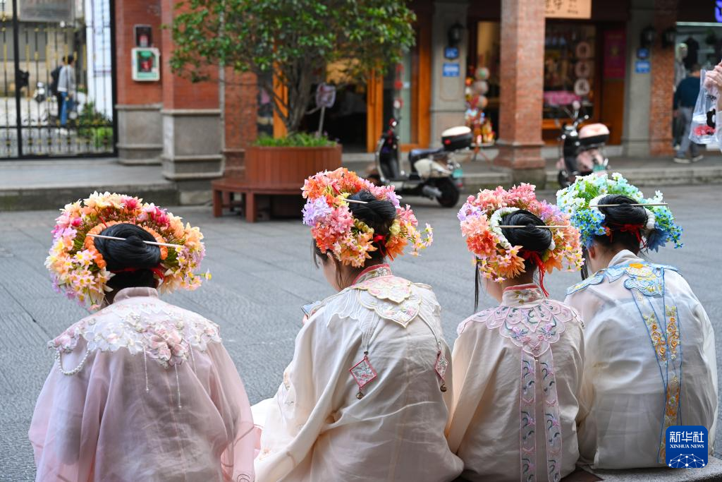 4月10日,在泉州中山路,几名体验蟳埔女簪花围的游客坐在街边小憩。新华社记者 周义 摄