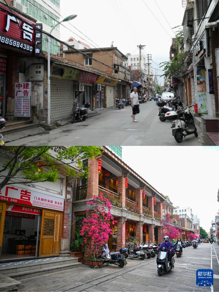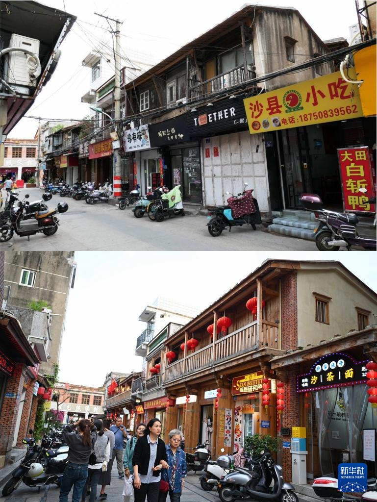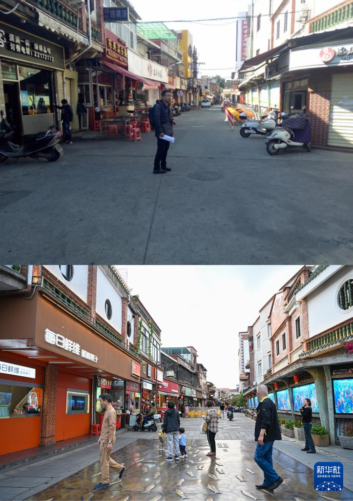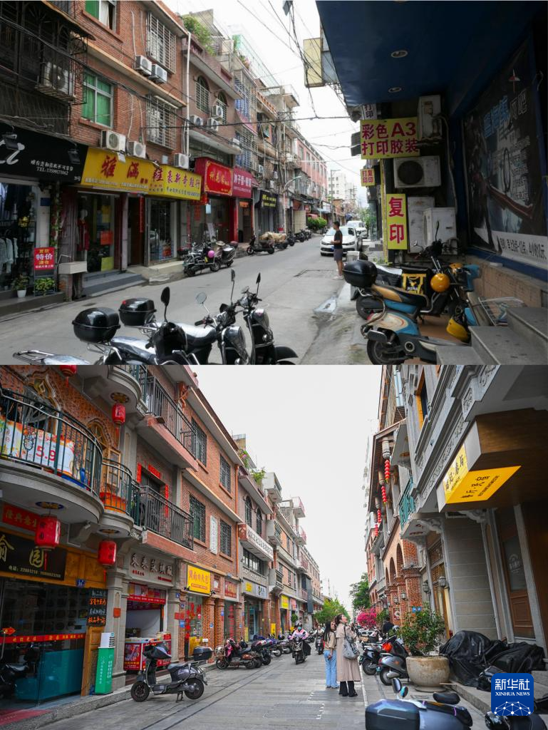 拼版照片:上图为中山路传统商业区改造前的街景(资料照片);下图为同一地点改造后的街景(4月10日摄)。新华社记者 周义 摄