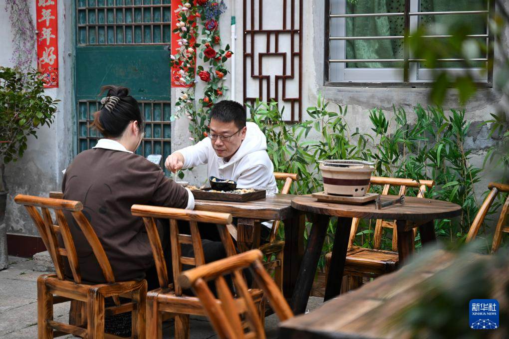 4月10日,游客在泉州中山路的一处庭院内喝茶、品尝小吃。新华社记者 周义 摄