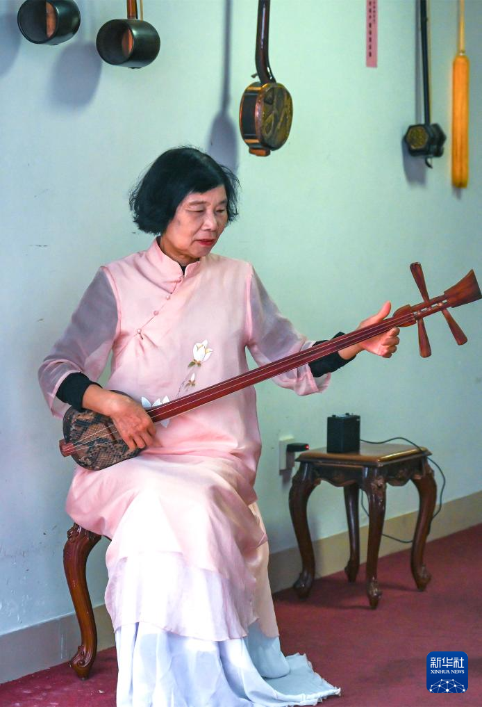 4月10日,在泉州中山路,一名当地居民学习南音弹唱。新华社记者 周义 摄