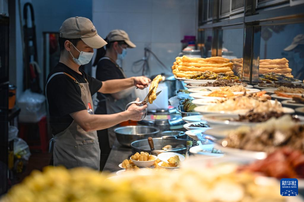 4月10日,在泉州中山路的一家传统老字号店铺里,工作人员制作美食。新华社记者 周义 摄