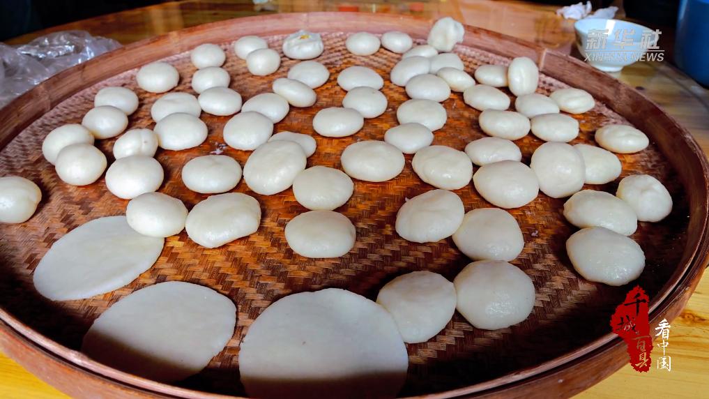 白粿是福建省南平市顺昌县元坑镇赖源村的特色小吃。制作白粿的原料是粳米,上锅蒸软后的粳米放进石臼,捣成米团,之后将米团掰成小块,再次放入锅中蒸软。蒸软后对米团进行第二次捶打,经过两次的捶打,软糯筋道的白粿皮便做好了。将米团拽成块,揉圆,用自制的模具压扁,放入肉丝、芋子、笋干等各色馅料,包成不同形状。一口咬下去,浓郁的米香伴着馅料的香味便在口中散开,吃起来香醇温润,充满韧性。