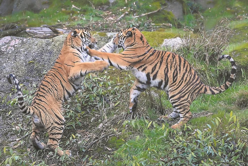 “老虎是独居动物,平日里,异性之间不相往来,只有发情交配时才短暂结合。”林锡潘说,母虎长到两岁半左右,就到了谈婚论嫁阶段,一年四季都能发情。发情表现虽存在个体差异,但大多有迹可循——采食量下降,兴奋异常,频繁走动,身体蹭擦墙壁和地板,向四周喷洒尿液,周边公虎不时发出求偶的吼叫声。
