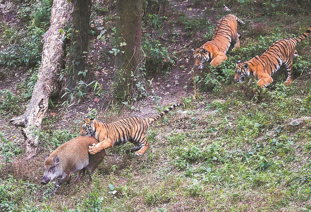 “我们采取‘循序渐进、自我学习、逐步提高、不断巩固’的方法,对3月龄以上的虎提供活体野兔、山鸡进行捕猎训练;对亚成体虎提供小野猪进行捕猎训练;对成年虎提供成年野猪、梅花鹿等大型动物进行捕猎训练。”林开雄说,为了提供充足的活体猎物,虎研所引进了野猪、梅花鹿、河麂等种群,并自我扩繁。2005年,首次实现了虎在人工散放条件下的野外成功繁殖并哺育成功。2017年建成的华南虎野化训练基地和华南虎食物种源基地,是全国面积最大的华南虎繁育野化训练基地。目前,梅花山中国虎园饲养的36只虎中,有20只能够在散放区捕食野猪等大型活体猎物,并实现繁育后代。