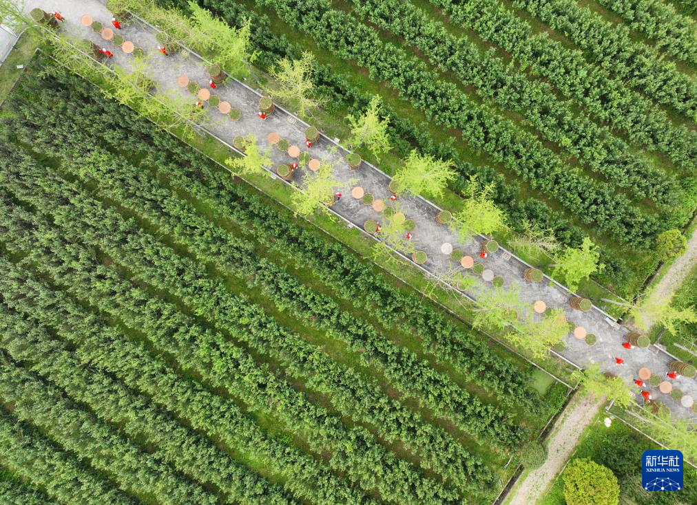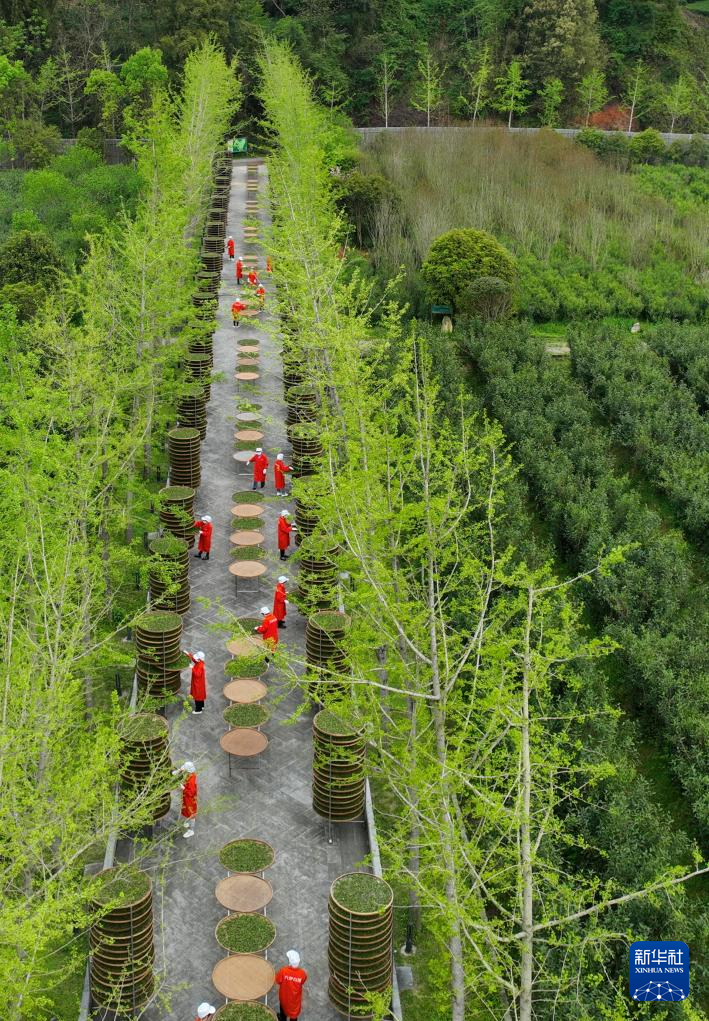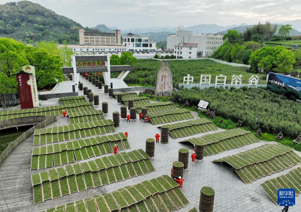 4月10日,工人在位于福鼎市点头镇大坪村的六妙白茶庄园晾晒茶青(无人机照片)。新华社记者 林善传 摄