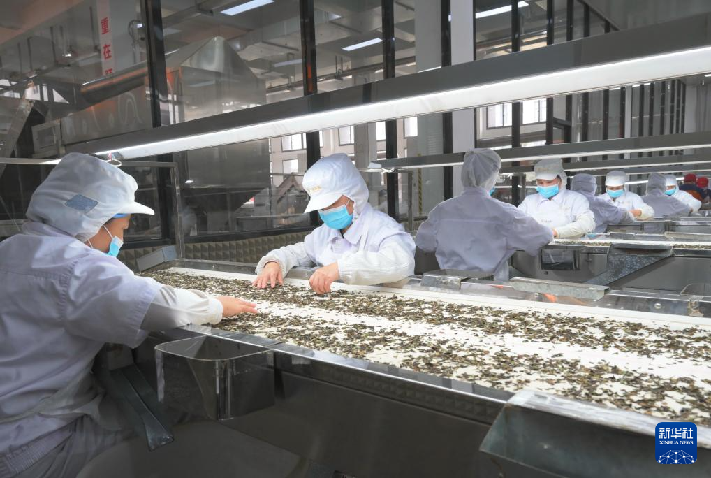4月10日,福建品品香茶业有限公司工人在生产车间流水线上挑拣茶叶。新华社记者 林善传 摄