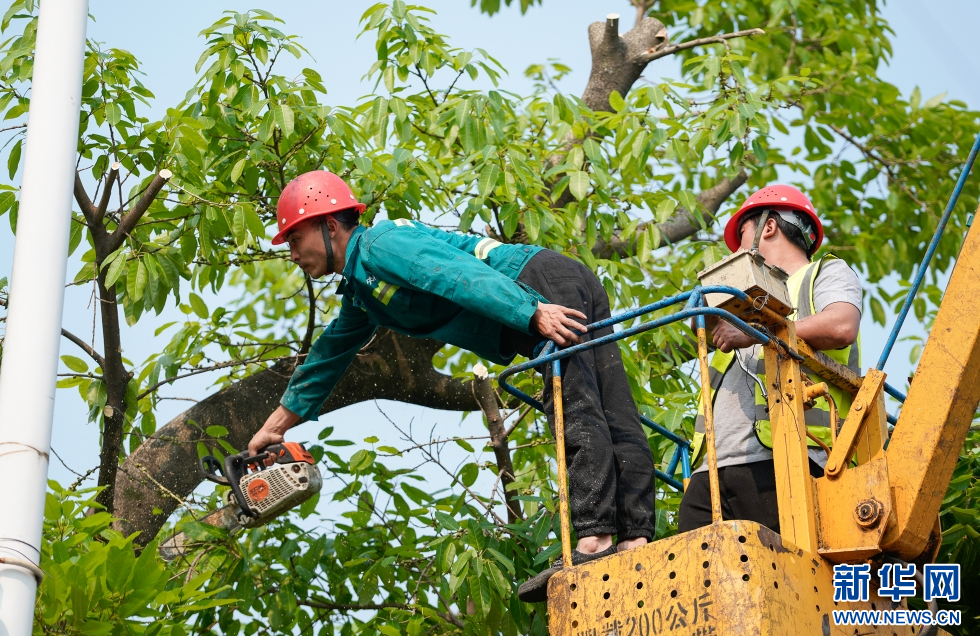 两名工人在高处进行榕树修剪作业。 新华网 蒋巧玲 摄
