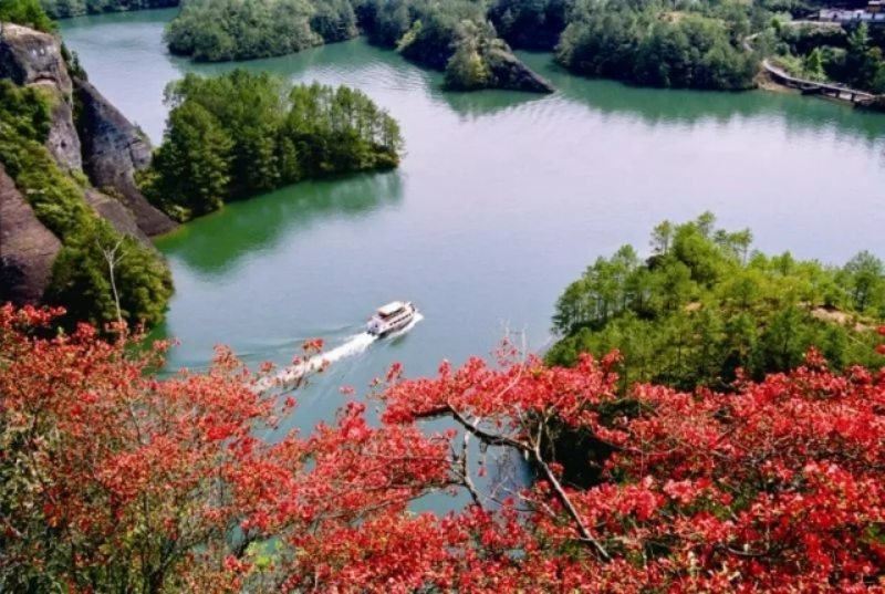 碧波澄澈、鸟翔鱼跃、丹峰竞秀、林木葱郁