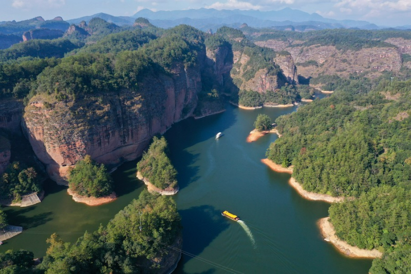 游船行驶在福建省三明市泰宁县大金湖湖面上,带领游客欣赏水上丹霞景观 (资料图)。新华社记者 姜克红 摄