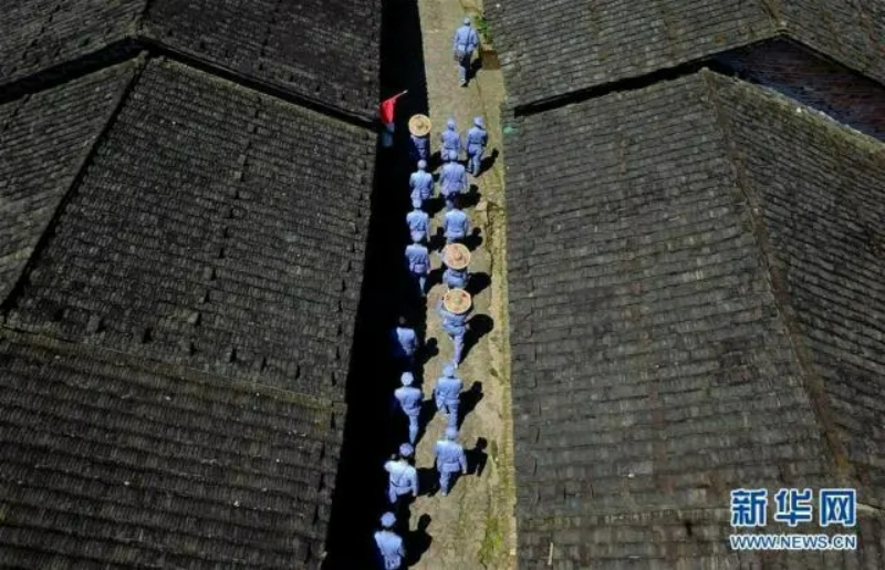 游客列队行进在长汀县南山镇中复村的红军街(无人机拍摄,资料图)。新华社记者 魏培全 摄