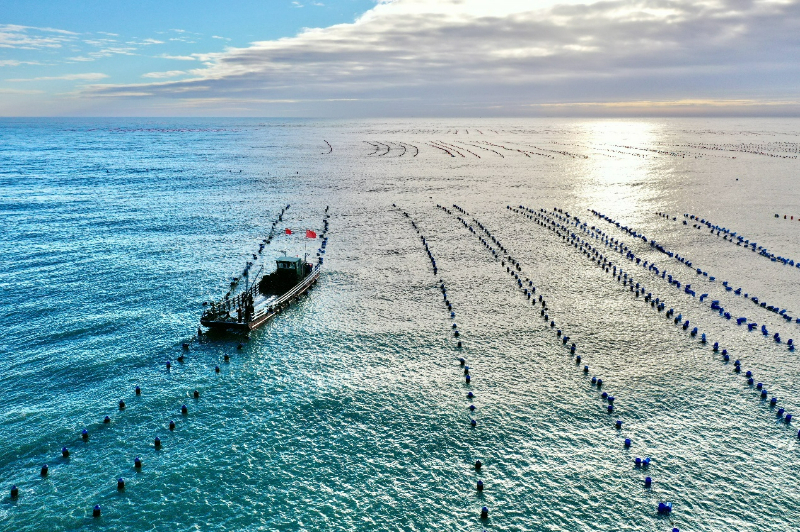 在福建省霞浦县三沙镇海域,生蚝采收船在进行采收作业(资料图)。新华社记者 姜克红 摄