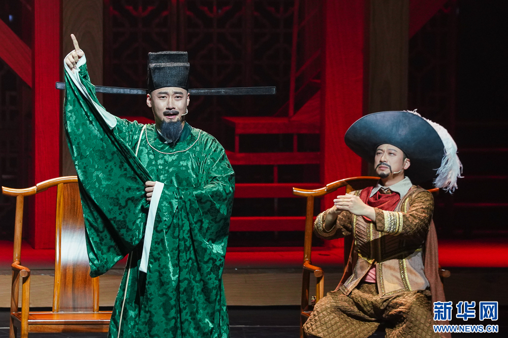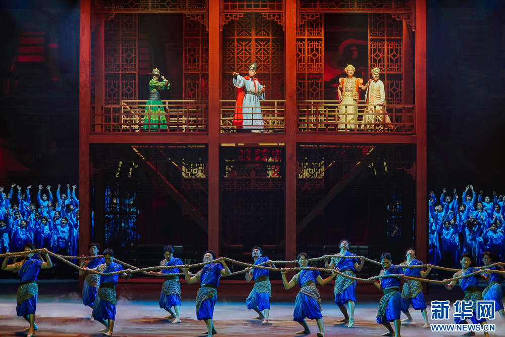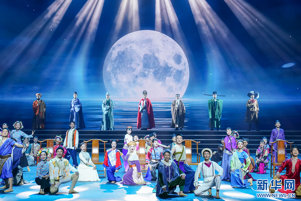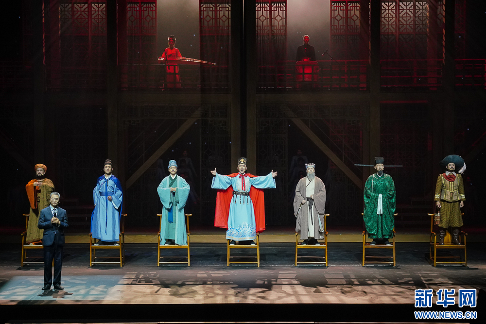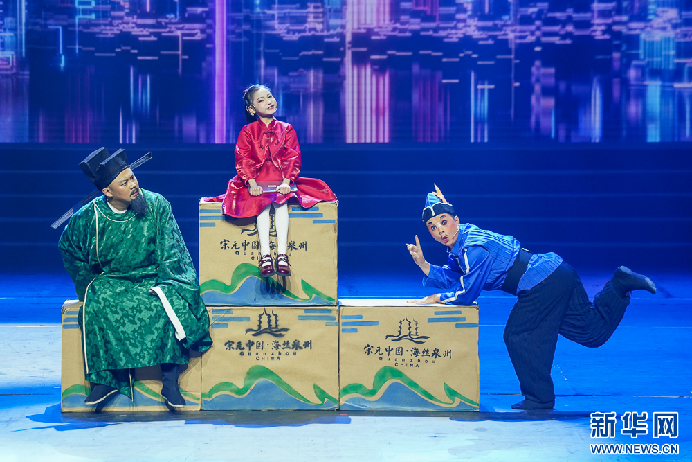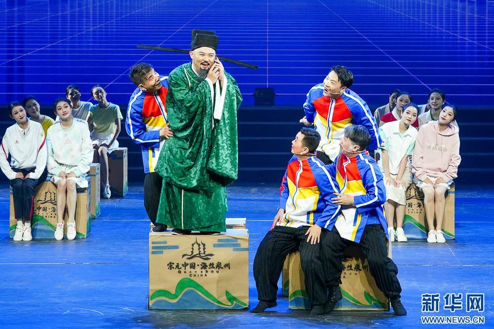 这是歌舞节目《千年海丝情》,泉州历史名人“穿越”到舞台现场(4月17日摄)。新华网 肖和勇 摄