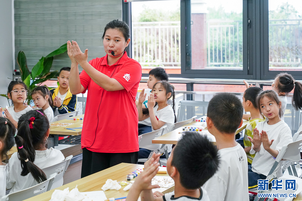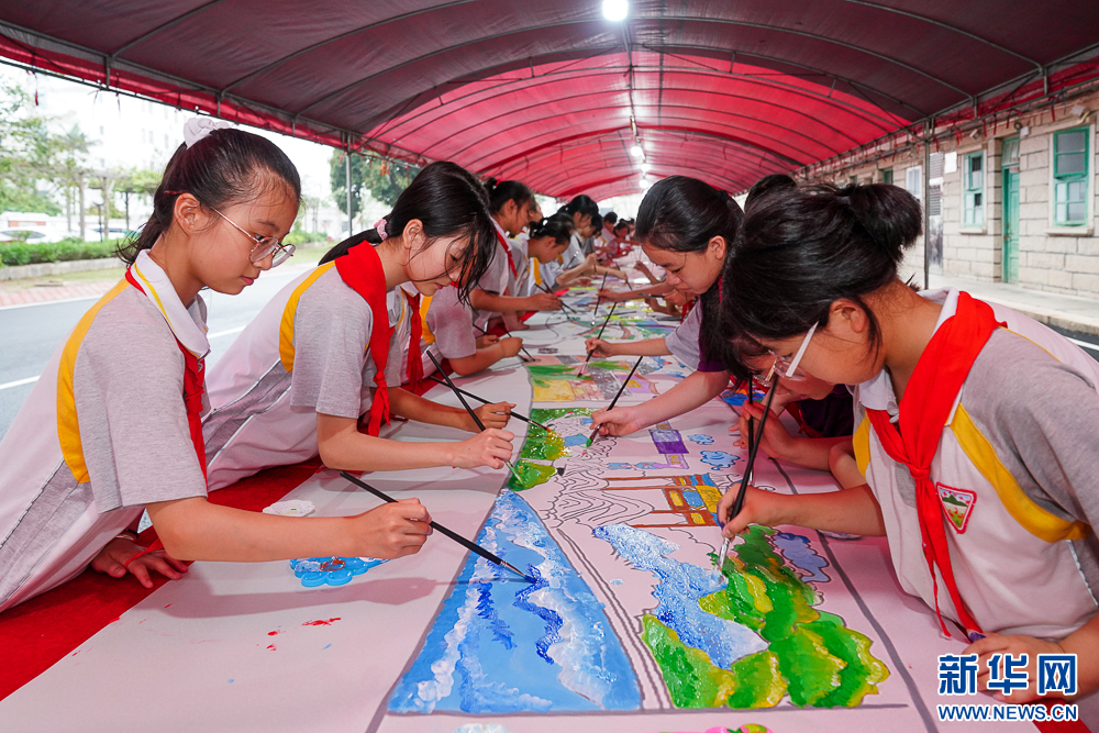 4月23日,漳州市长泰区岩溪镇,学生们一起手绘长卷,礼赞美丽乡村。新华网 肖和勇 摄