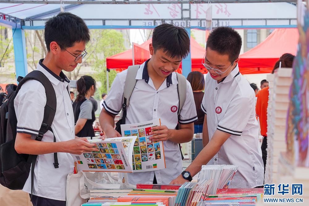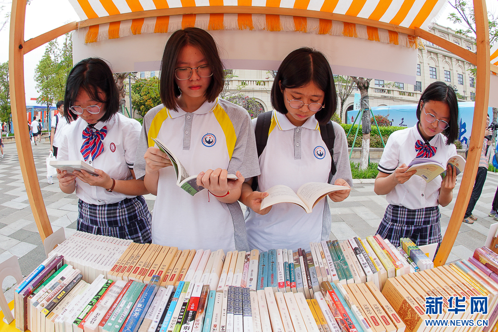 4月23日,漳州市长泰区图书市集,学生们在挑选自己喜爱的书籍。新华网 肖和勇 摄