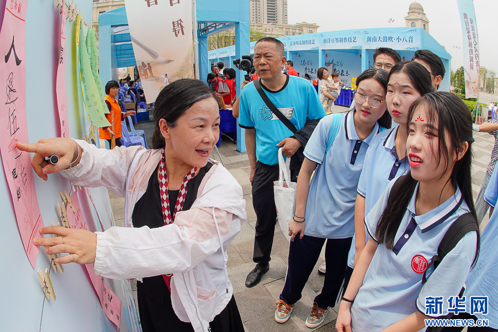 4月23日,漳州市长泰区举办国学主题灯谜会。演出结束后,演员和群众一起猜灯谜。新华网 肖和勇 摄