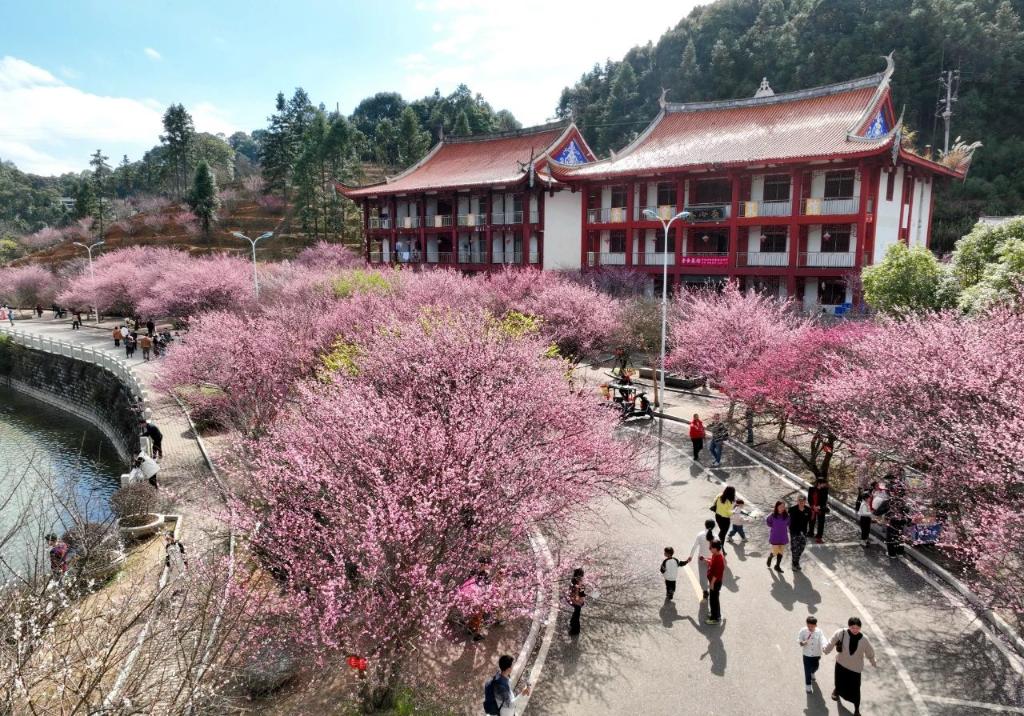 2月2日,龙岩市2024年樱花文化旅游节暨漳平市第十三届樱花文化旅游节在龙岩漳平永福镇开幕。台品樱花茶园是旅游节的核心景区,一树树娇艳的樱花在茶园铺开。茶园负责人谢东庆介绍,樱花盛时平均一天有2万至3万名游客前来参观。