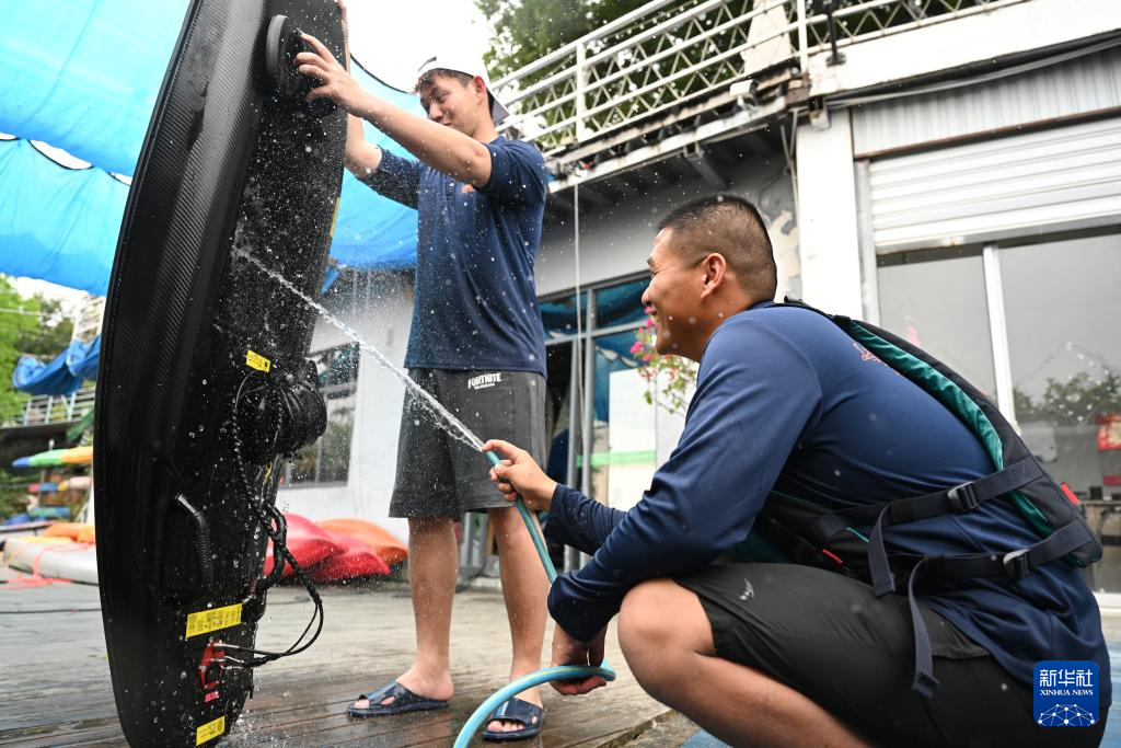 4月27日,水上运动爱好者在星安绿舟营地冲洗动力冲浪板。新华社记者 周义 摄