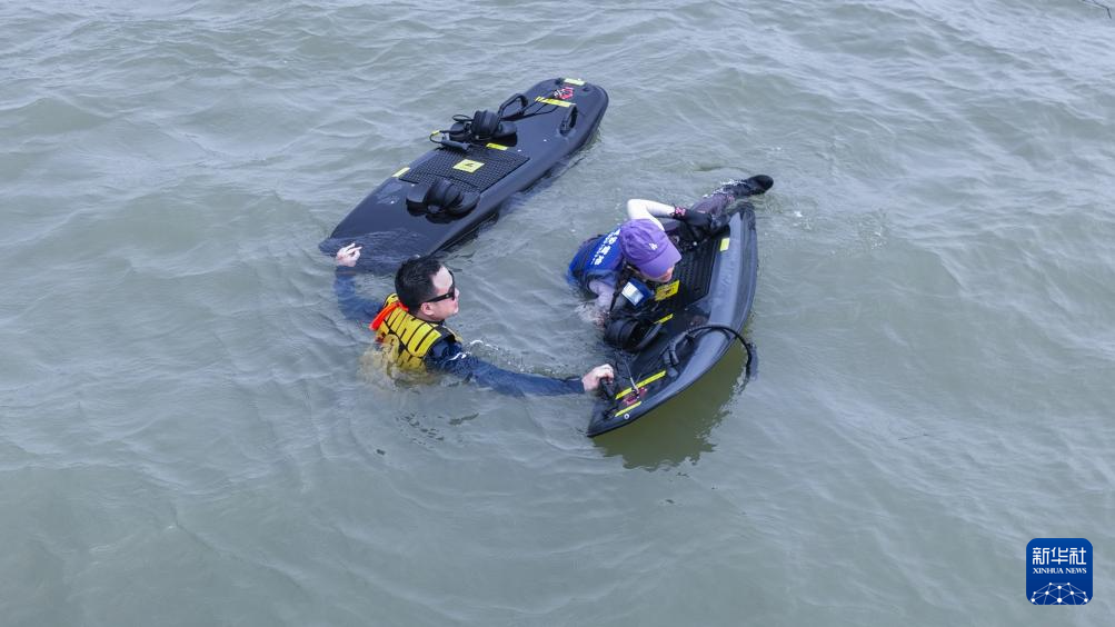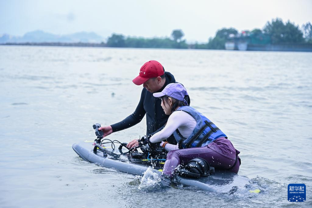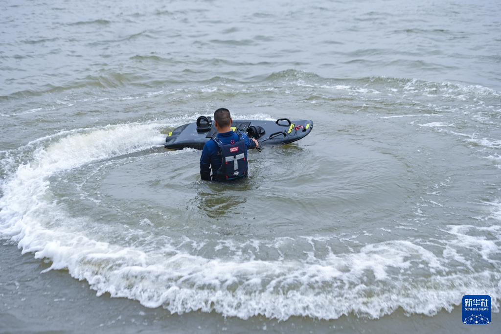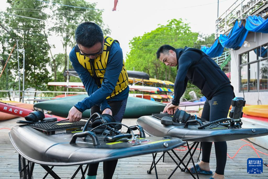 4月27日,水上运动爱好者在星安绿舟营地为动力冲浪板装上电池。新华社记者 周义 摄