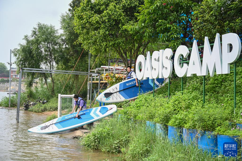 4月27日,水上运动爱好者在星安绿舟营地搬运桨板。新华社记者 周义 摄