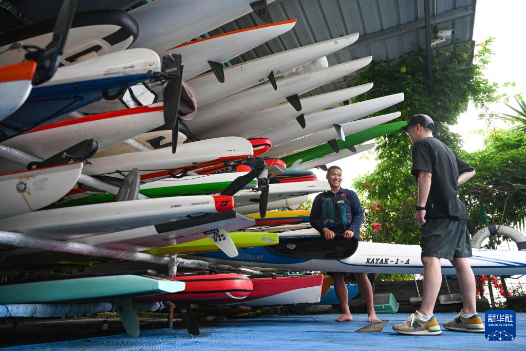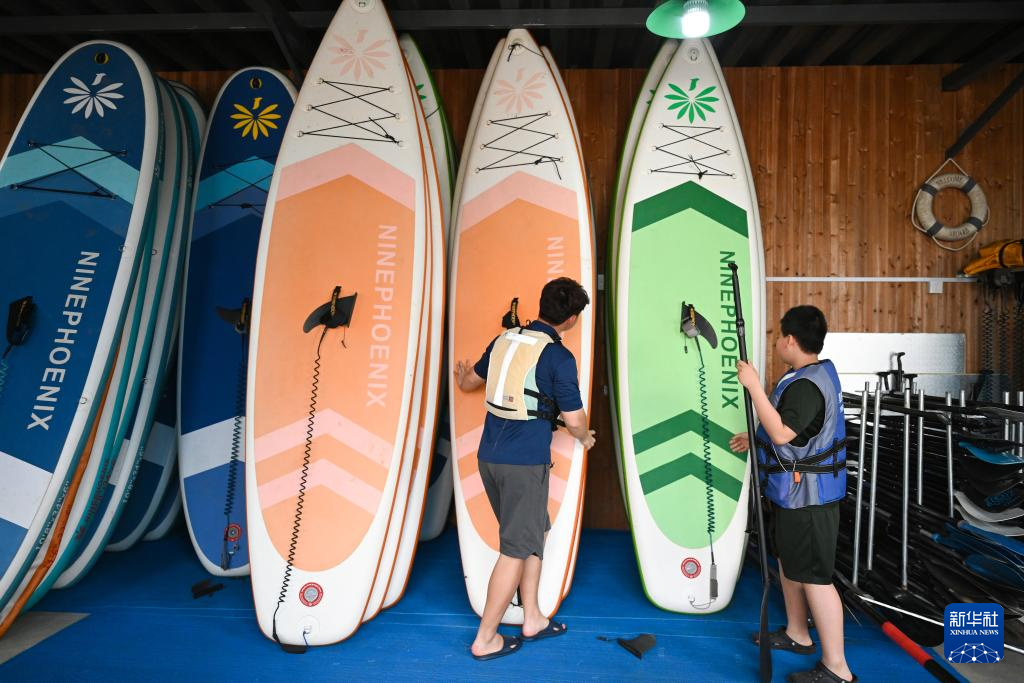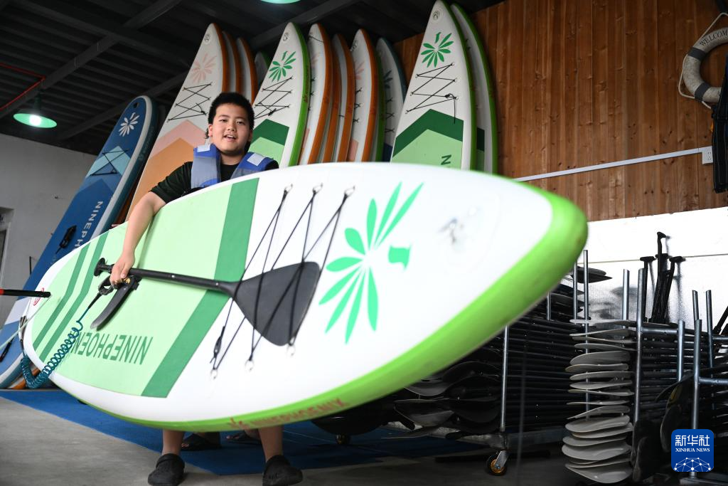4月27日,水上运动爱好者在星安绿舟营地选取桨板。新华社记者 周义 摄