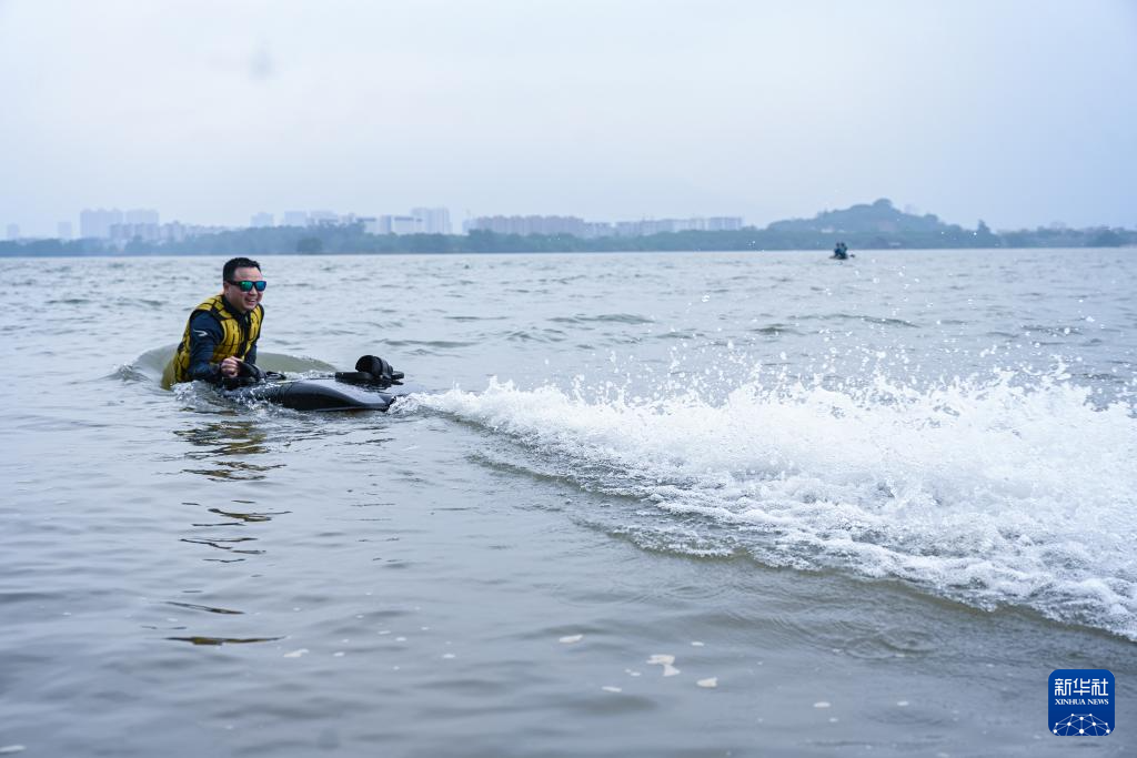 4月27日,一名水上运动爱好者在闽江上用动力冲浪板“打水仗”。新华社记者 周义 摄