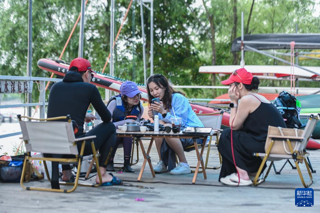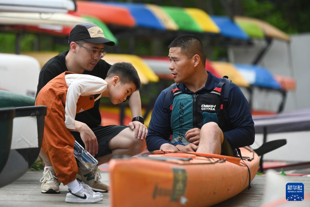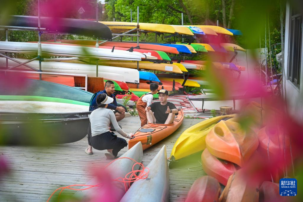 4月27日,水上运动爱好者在星安绿舟营地交流。新华社记者 周义 摄