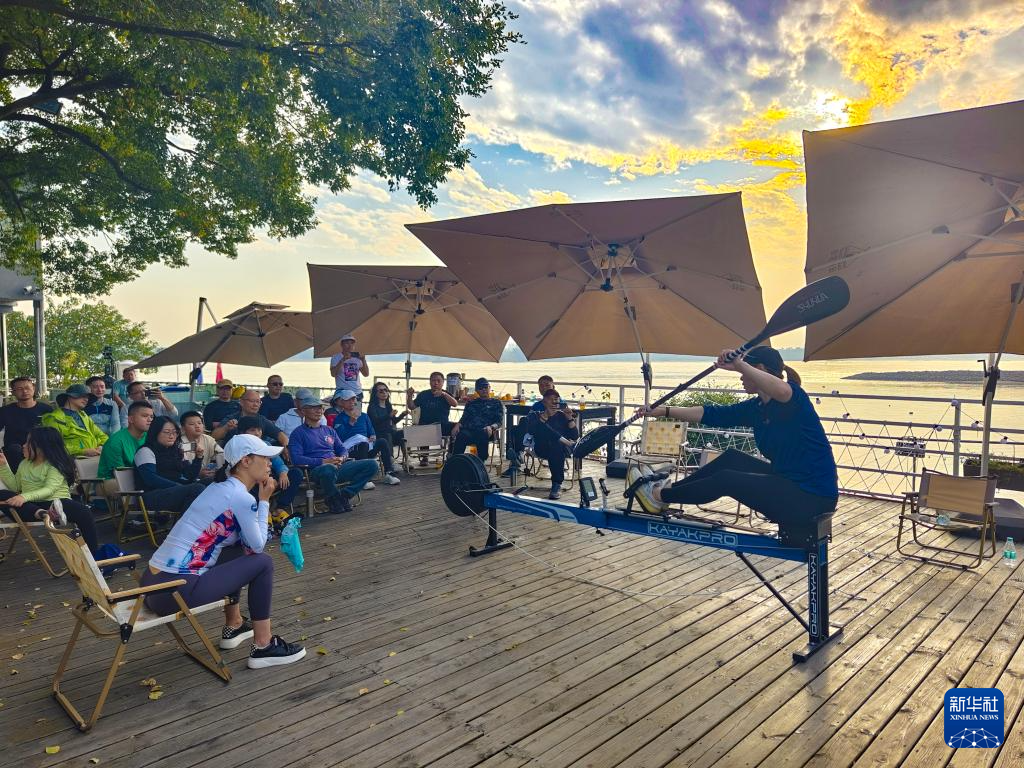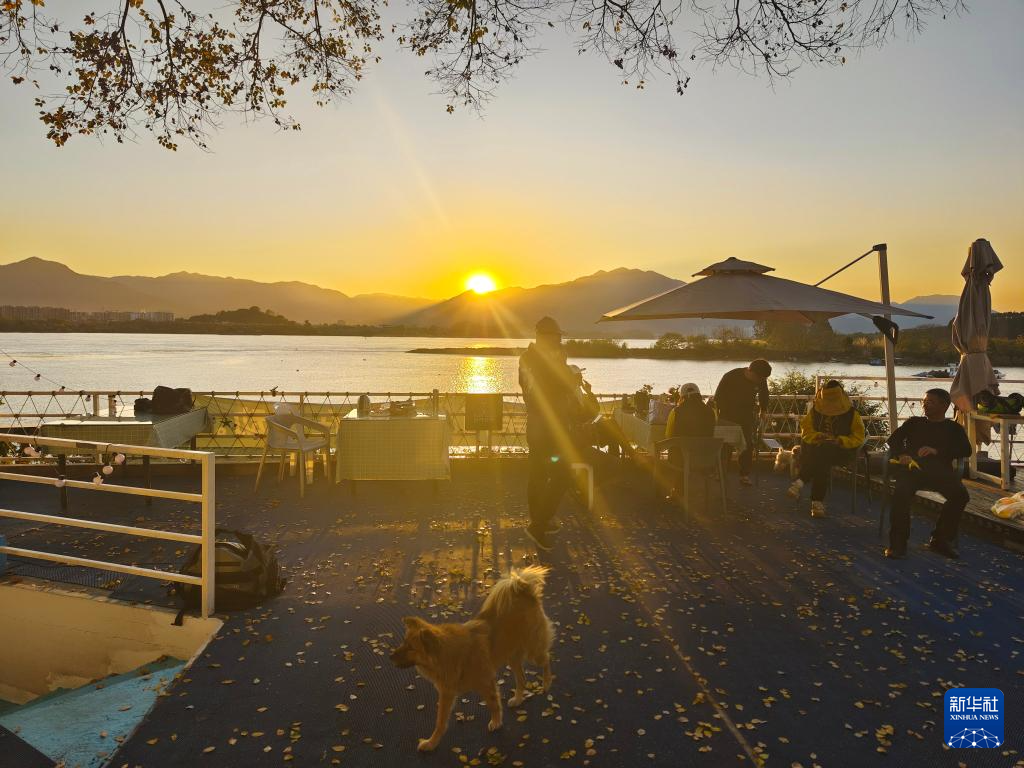 4月28日傍晚,水上运动爱好者在星安绿舟营地欣赏落日。新华社记者 周义 摄
