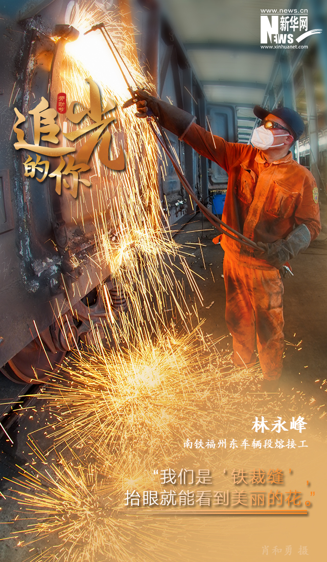 在中国铁路南昌局集团有限公司福州东车辆段检修车间预修库,熔接工林永峰与队友一起,把自己裹得严严实实,经受着多重“炙烤”:电焊、气割,飞溅的火花、以及焊接过后滚烫的构件……