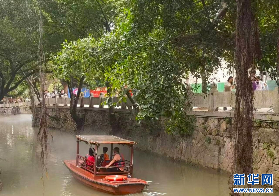 假期里,游客在体验三捷河游船。新华网 刘丰 摄