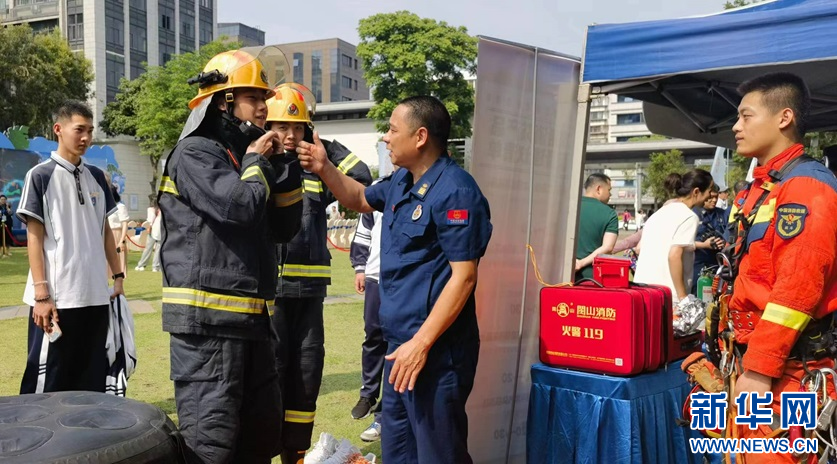 学生体验快速穿脱消防服。新华网 刘丰 摄