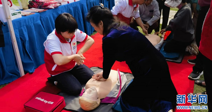市民现场体验心肺复苏操作。新华网 刘丰 摄