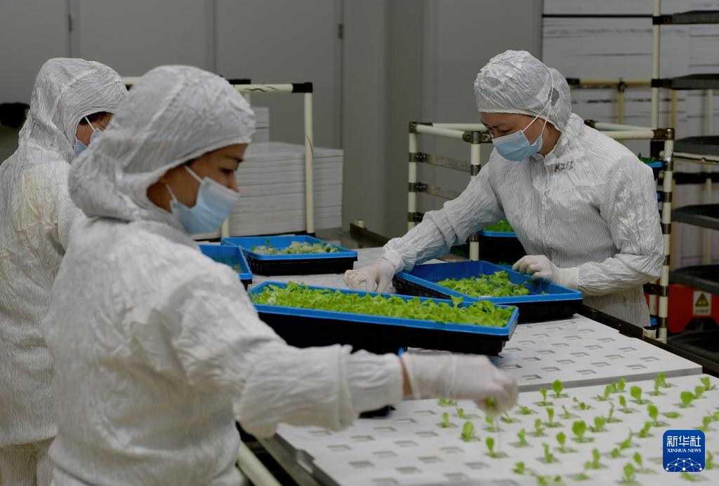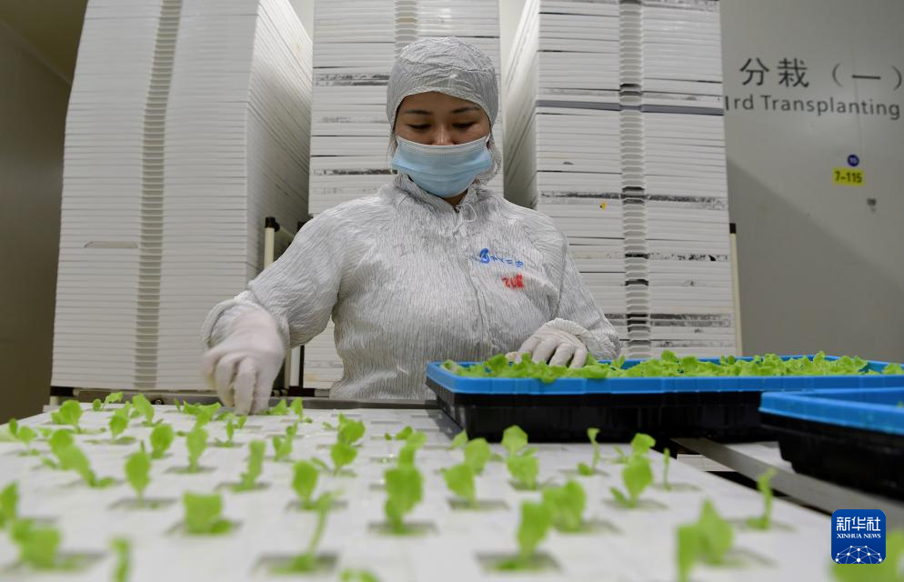 工作人员分栽发芽的生菜苗,准备进行LED灯照射(5月8日摄)。新华社记者 魏培全 摄