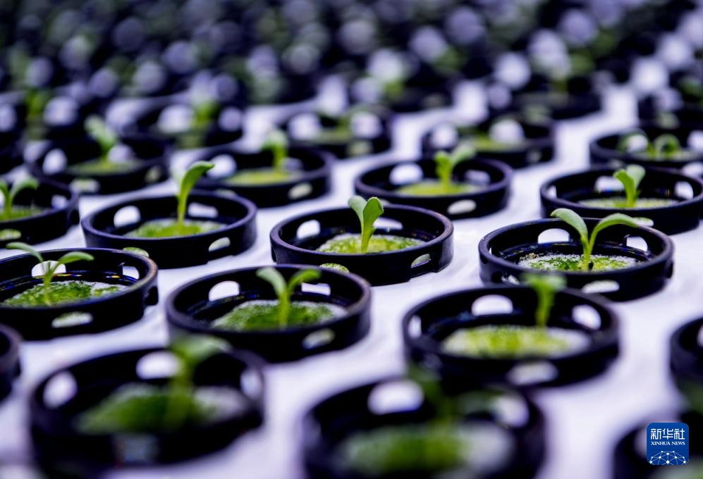 生菜种子在特殊的LED灯照射下成长(5月8日摄)。新华社记者 魏培全 摄