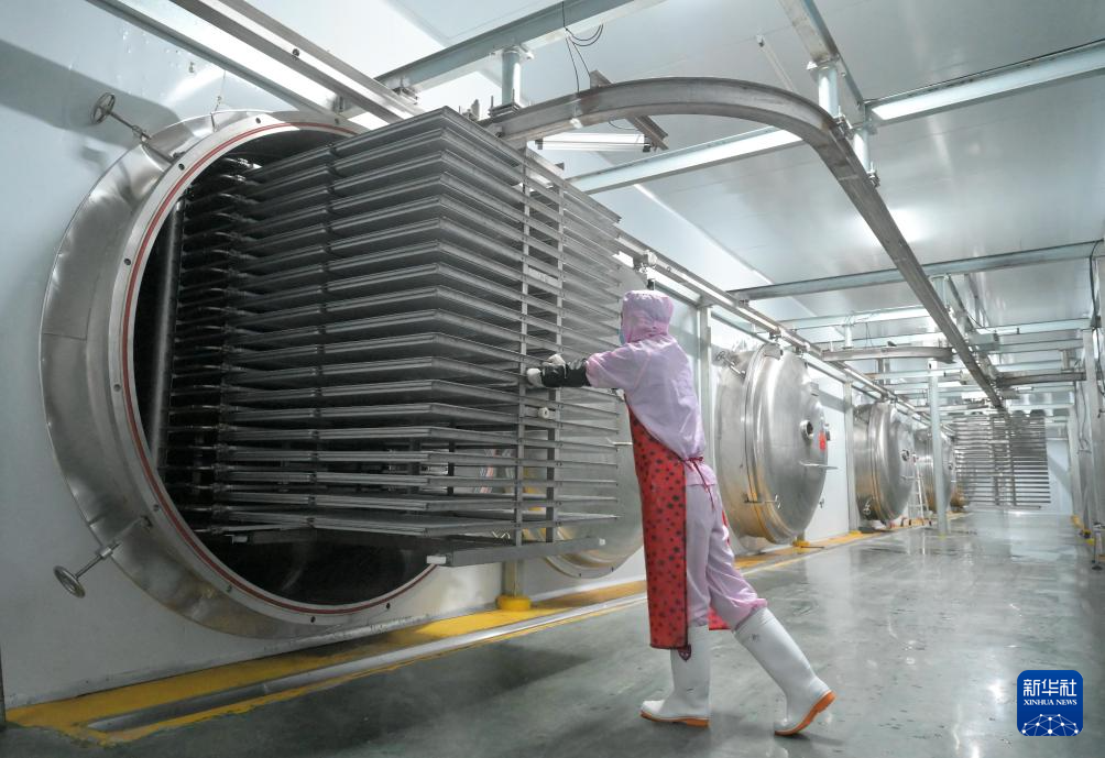 5月10日,在福建省宁德市古田县,三朵银花(福建)食品有限公司员工把银耳羹推进冻干设备进行真空干燥。