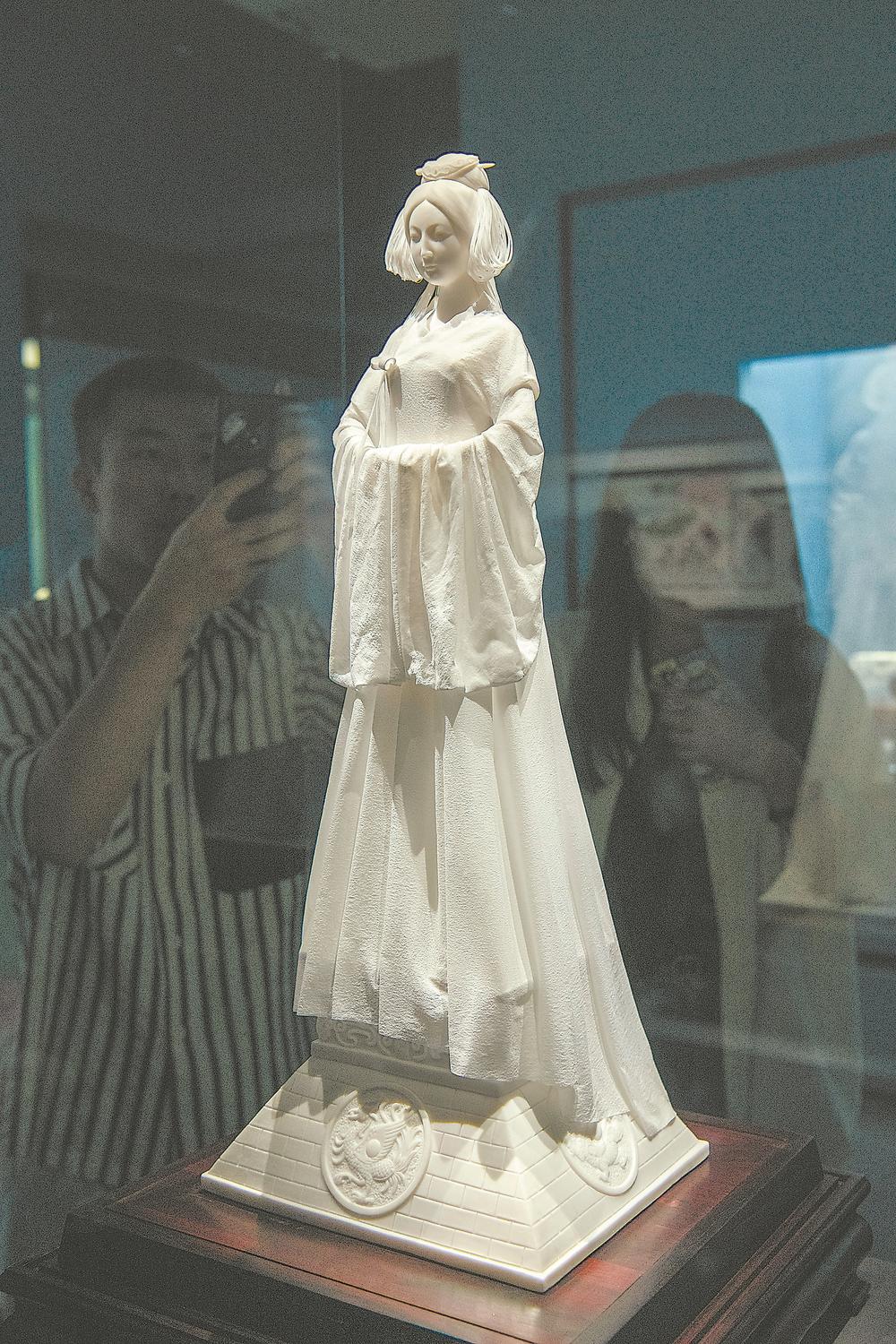 何以中国白?发丝芊芊,亭亭玉立,身披轻盈白纱袍,隔着薄如蝉翼的衣袖,还能看到手指……继去年在中国国家博物馆赢得满堂彩后,白瓷雕塑《神话》又在近期举行的广交会上向大众展现了“远看是纱,近看是瓷”的魅力。