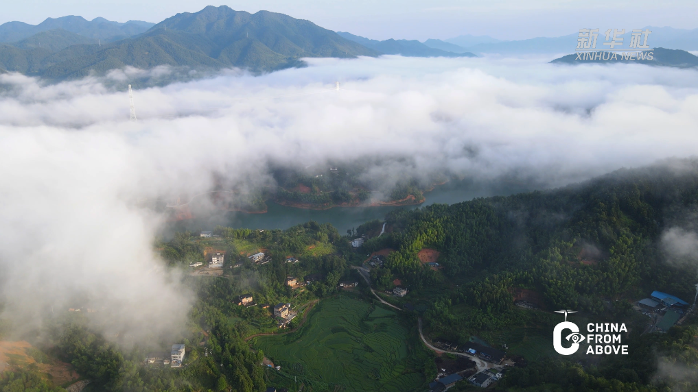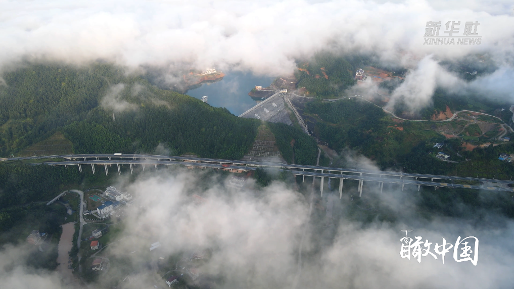 在福建省泉州市德化县云龙湖,水面轻烟袅袅升起,与远处山峦间的云雾交融。碧波之上,云的倒影与实体交相辉映,虚实难辨,如同踏入一幅动态的山水画卷。
