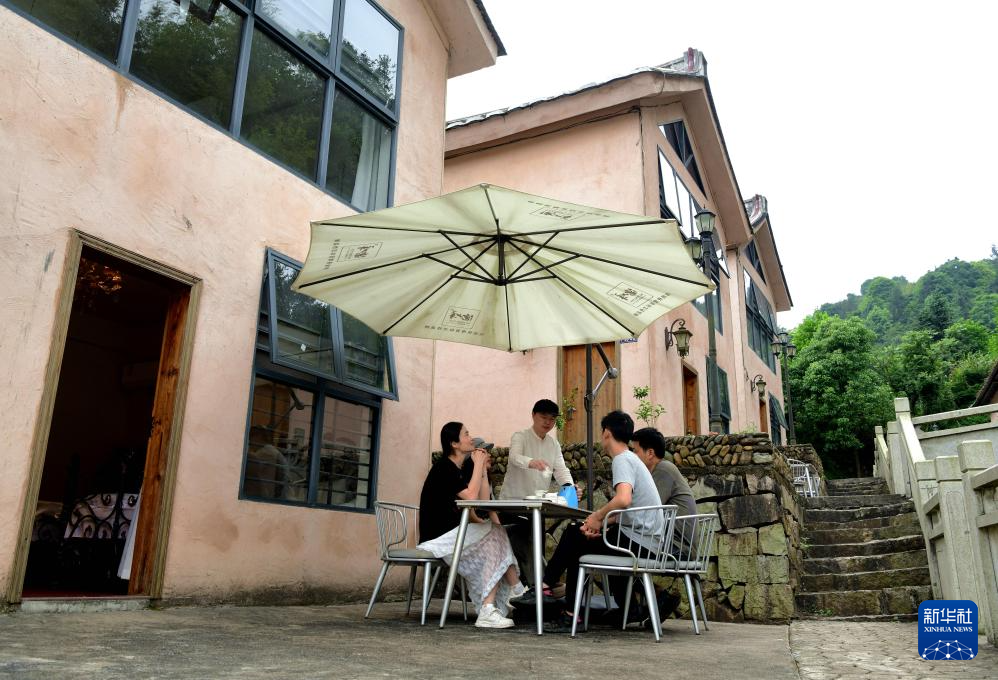在安溪县西坪镇盖竹村的德峰茶庄园,几名游客在民宿旁品尝铁观音(5月9日摄)。新华社记者 魏培全 摄