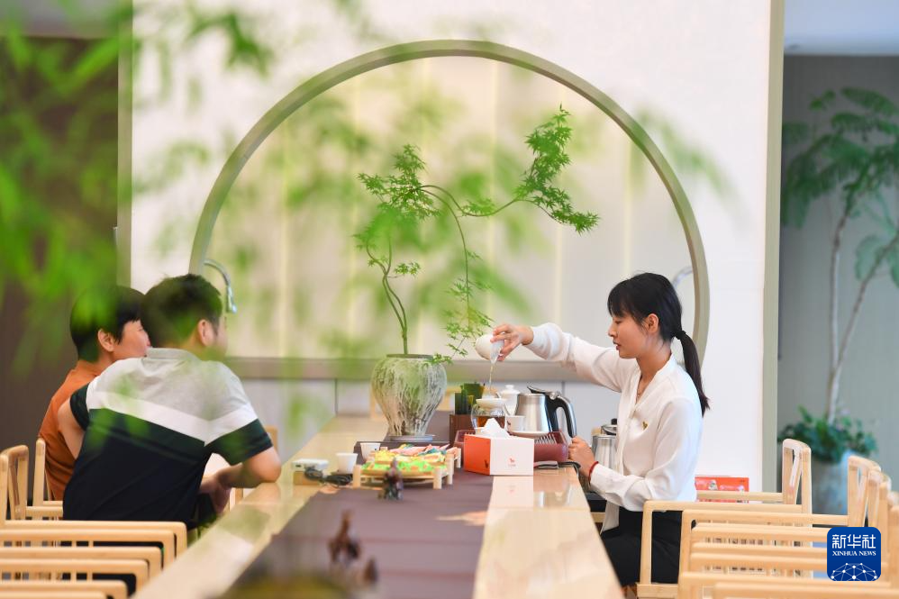 5月7日,在武夷山市一茶企展厅内,工作人员为客人泡茶。新华社记者 姜克红 摄