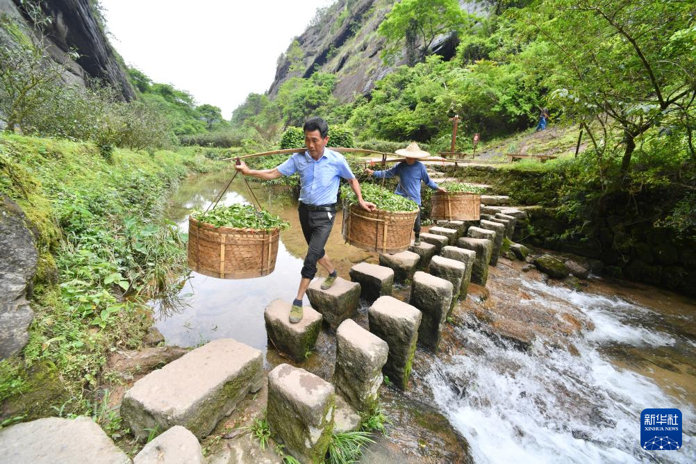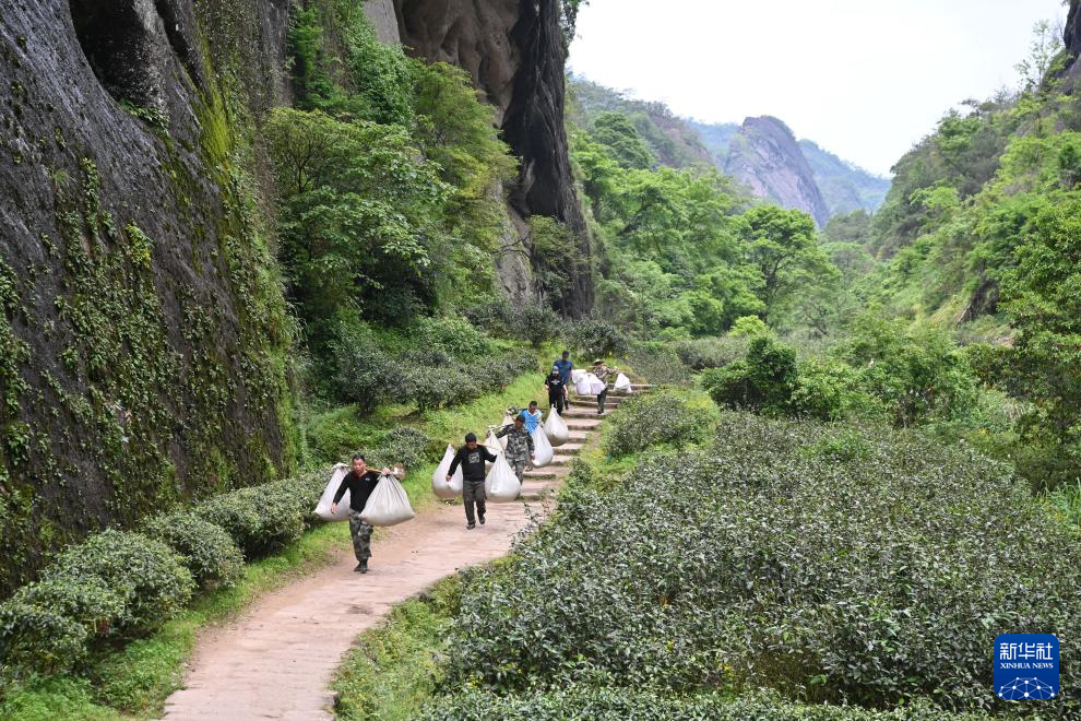 5月7日,在武夷山岩茶核心产区内,工人在挑运茶青。新华社记者 姜克红 摄