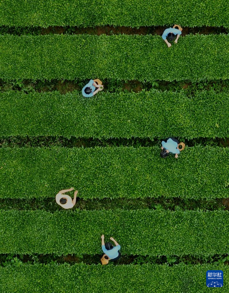 工人在安溪县西坪镇珠洋村的八马红星茶场茶园里采摘茶叶(5月9日摄,无人机照片)。新华社记者 魏培全 摄