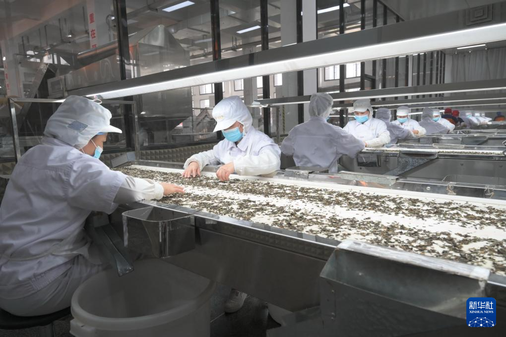 福建品品香茶业有限公司工人在生产车间流水线上剔除茶梗等杂质(4月10日摄)。新华社记者 林善传 摄