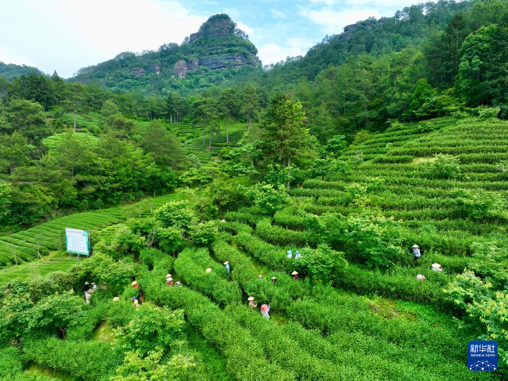 5月7日,在武夷山市星村镇燕子窠生态茶园内,工人在手工采茶(无人机照片)。新华社记者 姜克红 摄