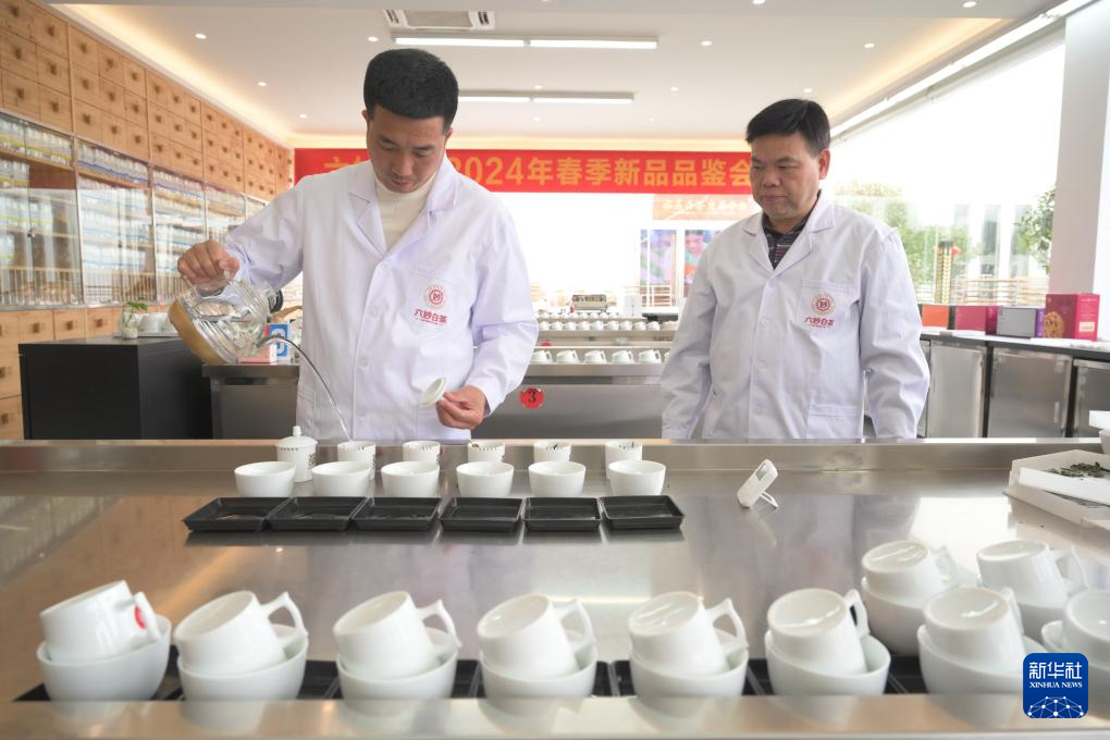 非物质文化遗产福鼎白茶制作技艺传承人陈家雅(左)在六妙白茶研发中心审评福鼎白茶(4月11日摄)。新华社记者 林善传 摄
