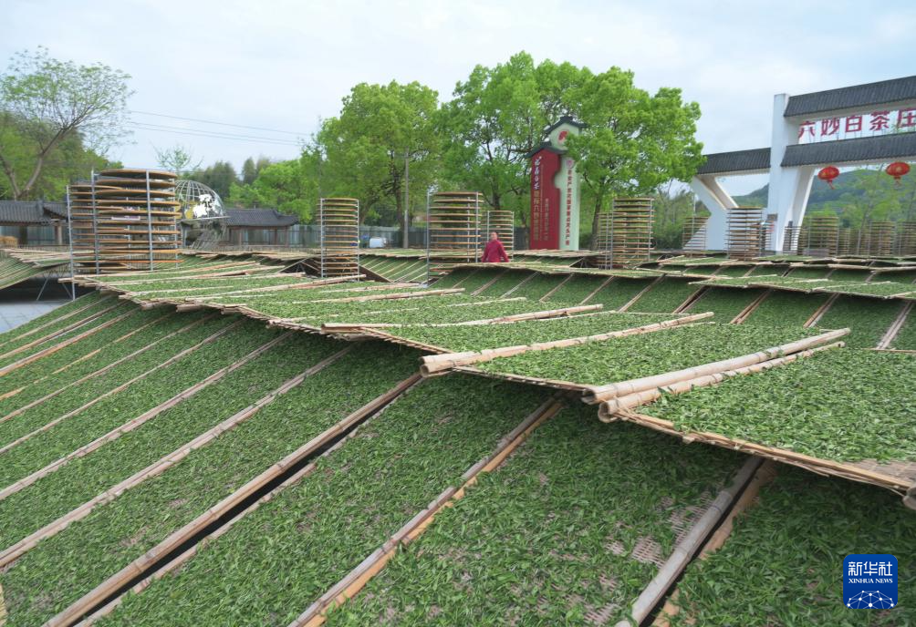 工人在位于福鼎市点头镇大坪村的六妙白茶庄园晾晒茶青(4月10日摄)。新华社记者 林善传 摄