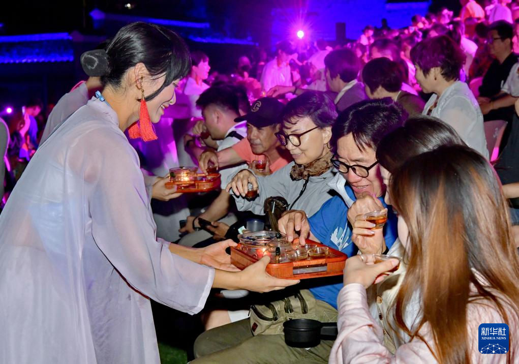 5月8日,在武夷山以茶文化为主题的印象大红袍山水实景演出中,演员为观众敬茶。新华社记者 姜克红 摄