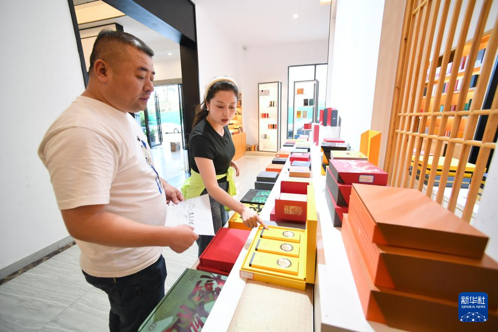 5月7日,在武夷山旺角包装文化创意园,顾客(右)在挑选茶叶包装礼盒。新华社记者 姜克红 摄