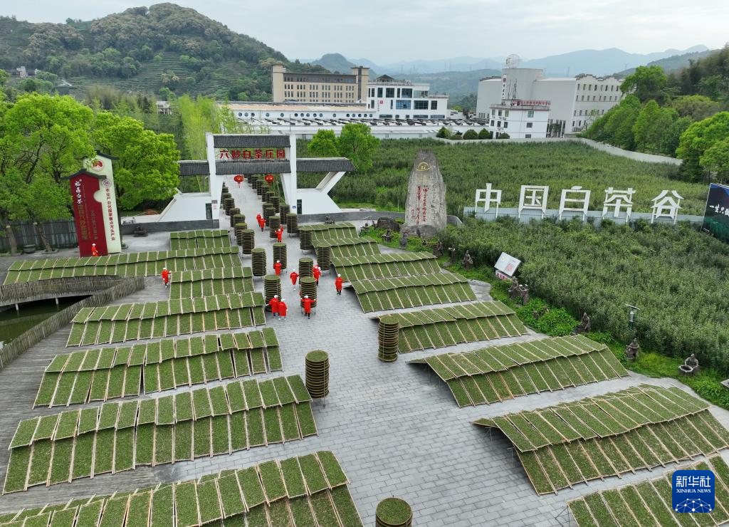 工人在位于福鼎市点头镇大坪村的六妙白茶庄园晾晒茶青(4月10日摄,无人机照片)。新华社记者 林善传 摄