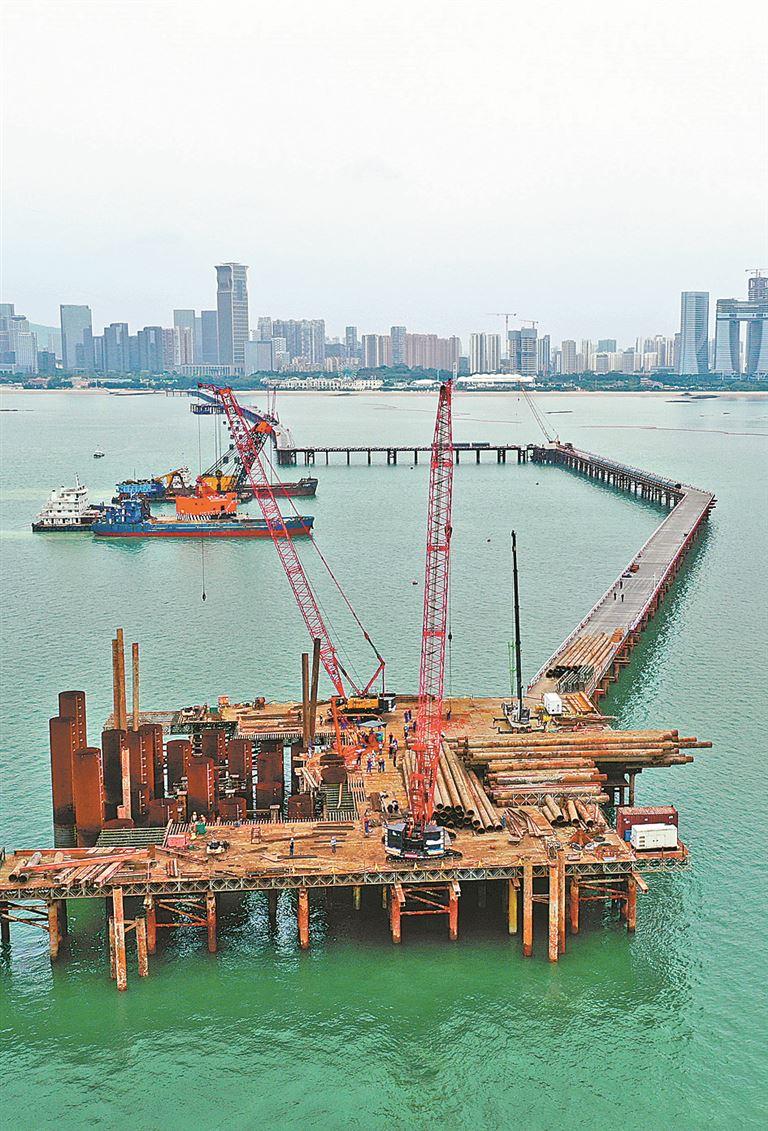 离岸建桥、海中作业,桩基是打开施工面的基础。据代建单位厦门路桥工程公司A1标段项目经理眭文飞介绍,本次开钻桩基位于离岸2.4公里海面上,其桩长47.8米,桩径3米,属支撑刘五店悬索桥西主塔稳固海上的“落脚点”之一。